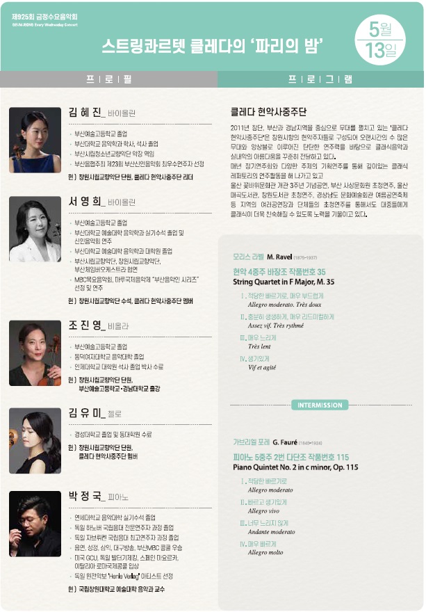 제925회 금정수요음악회 <스트링콰르텟 클레다의 ‘파리의 밤’>